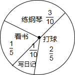 1.小颖某一天的活动时间中$\frac{2}{5}$的时间打球,$\frac{3}{10}$的时间练习钢琴,$\frac{1}{10}$的时间来写日记,剩余的时间则用来看书,根据这些数据作出小颖活动时间分布统计图.