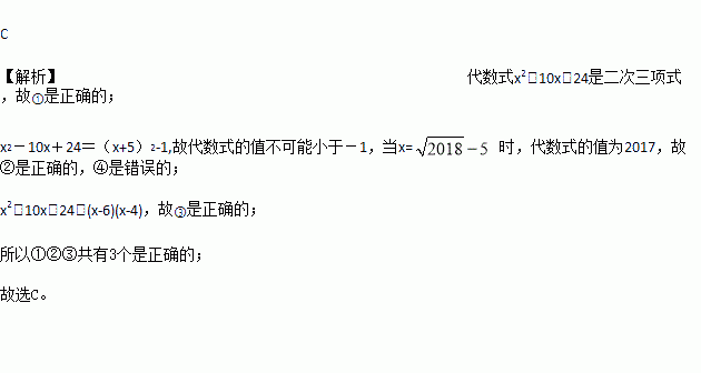 对于代数式x2-10x+24,下列说法:①它是二次三项式; ②该代数式的值可能等于2017;③分解因式的结果是(x-4)(x-6);④该代数式的值可能小于-1.其中正确的有( )