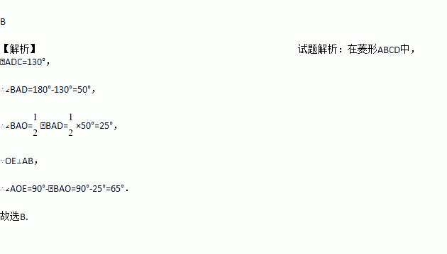 如图,在菱形ABCD中,对角线AC与BD相交于点O,OE⊥AB,垂足为E,若∠ADC=130°,则∠AOE的大小为( )