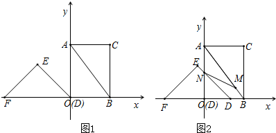 1.如图,矩形OACB的顶点O是坐标原点,顶点A,B分别在y轴,x轴的正半轴上,OA=8,OB=6,等腰直角三角形EFD按图①摆放(点D与点O重合)FD=10,连接AB,△EFD从图①位置出发,以每秒1个单位的速度沿OB方向匀速移动,同时,点M从A出发,以每秒2个单位沿AB-BC匀速移动,AO与△EFD的直角边相交于点N.当M到达点C时,△EFD同时停止运动,连接MN,设移动时间为t(s),t>0.解答下列问题: