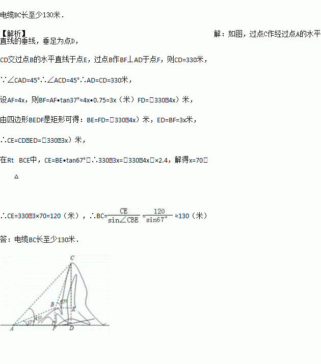 如图,电信部门计划修建一条连接B、C两地电缆,测量人员在山脚A处测得B、C两处的仰角分别是37°和45°,在B处测得C处的仰角为67°.已知C地比A地髙330米(图中各点均在同一平面内),求电缆BC长至少多少米?