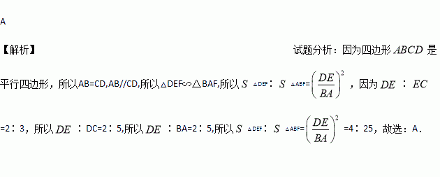 如图,在平行四边形ABCD中,E为CD上一点,连接AE、BD,且AE、BD相交于点F,DE:EC=2:3,则S△DEF:S△ABF等于( )