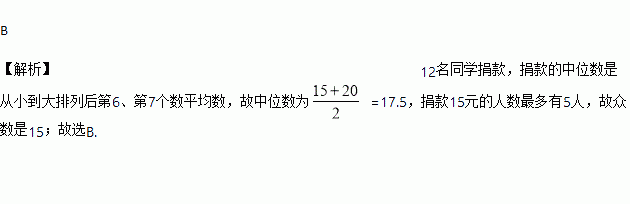 某班第一组12名同学在“爱心捐款”活动中,捐款情况统计如下表,则捐款数组成的一组数据中,中位数与众数分别是( )