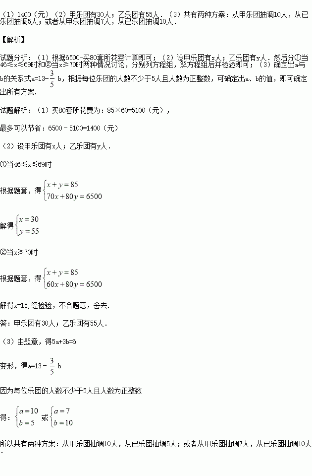经调查:两个乐团共85人(甲乐团人数不少于46人),如果分别各自购买演出服,两个乐团共需花费6500元.请回答以下问题: