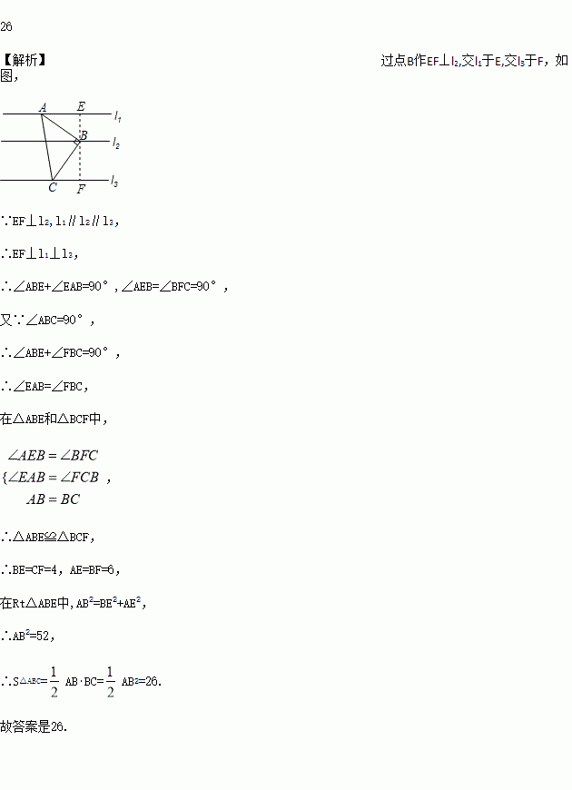 如图,Rt△ABC中,∠ABC=90°,AB=BC,直线l1、l2、l3分别通过A、B、C三点,且l1∥l2∥l3.若l1与l2的距离为4,l2与l3的距离为6,则Rt△ABC的面积为___________.