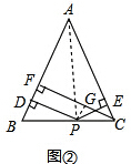 小军的证明思路是:如图2,连接AP,由△ABP与△ACP面积之和等于△ABC的面积可以证得:PD+PE=CF.