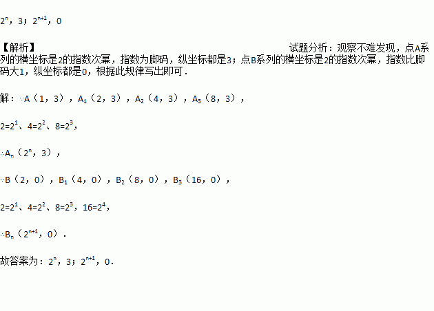 如下图所示,在直角坐标系中,第一次将△OAB变换成△OA1B1,第二次将△OA1B1变换成△OA2B2,第三次将△OA2B2变换成△OA3B3, 已知A(1,3),A1 (2,3), A2 (4,3), A3 (8,3),B(2,0), B1 (4,0), B2 (8,0), B3 (16,0),观察每次变换前后的三角形有何变化,找出规律,按此变换规律将△OA3B3变换成△OAnBn, ,则An的坐标是_______ ,Bn的坐标是_________ .
