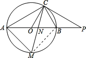 (2)连接BM,由于M是弧AB中点,那么AM=BM,而∠AMB=90°,易知∠MAB=∠MBA=45°,而AC=CP,则∠P=∠CAO,又∠BCP=∠CAO,从而有∠P=∠BCP,即BC=BP=3,而∠CBO=2∠P,∠BOC=2∠CAO,于是∠BOC=∠CBO,而OB=OC,那么可证△BOC是等边三角形,从而有OB=BC=3,即AB=6,在Rt△AMB中,利用特殊三角函数值可求AM.