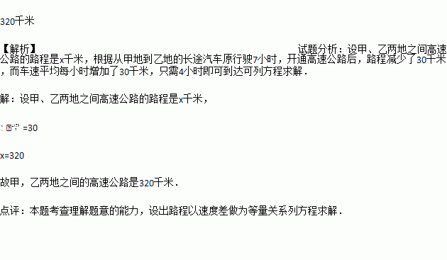 从甲地到乙地,长途汽车原需行驶7个小时,开通高速公路后,路程缩短了30千米,车速平均每小时增加了30千米,结果只需4个小时即可到达,求甲乙两地之间高速公路的路程。
