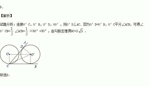 如图,∠ACB=60°,半径为2的⊙O切BC于点C,若将⊙O在CB上向右滚动,则当滚动到⊙O与CA也相切时,圆心O移动的水平距离为( )