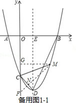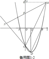 £¨2£©ÈôµãNÔÚÉäÏßCDÉÏ£¬È籸ÓÃͼ1-1£¬ÑÓ³¤MN½»yÖáÓÚµãF£¬¹ýµãM×÷MG¡ÍyÖáÓÚµãG£®Ò×Ö¤¡÷MCN¡×¡÷DBE£¬µÃµ½MN=2CN£®ÉèCN=a£¬ÔòMN=2a£®Çó³öMG=FG=$\frac{3\sqrt{2}}{2}$a£¬CG=FG-FC=$\frac{\sqrt{2}}{2}$a£¬´úÈëÅ×ÎïÏßy=£¨x-3£©£¨x+1£©£¬Çó³öaµÄÖµ£¬¼´¿ÉÖªMµÄ×ø±ê£»ÈôµãNÔÚÉäÏßDCÉÏ£¬È籸ÓÃͼ1-2£¬MN½»yÖáÓÚµãF£¬¹ýµãM×÷MG¡ÍyÖáÓÚµãG£®ÓÃÀàËÆµÄ·½·¨Çó³öaµÄÖµ£¬È·¶¨MµÄ×ø±ê£»