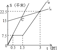´ÓͼÖпÉÒÔ¹Û²ì³ölA¾¹ý£¨0£¬15£©£¨3£¬22.5£©£¬½«Á½µã×ø±ê´úÈ뺯Êý¹ØÏµÊ½¼´¿É½âµÃk=2.5£¬b=15£¬