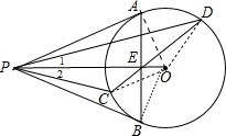 分析 连结OA、OC、OD,如图,利用切线长定理得PA=PB,∠APO=∠BPO,而OA=OB,可判断PO垂直平分AB,再根据切线的性质得OA⊥PA,加上∠AOE=∠POA,则可判断Rt△OAE∽Rt△OPA,得到OA:OE=OP:OA,即OA2=OE•OP,由于OC=OD=OA,所以OC2=OE•OP,OD2=OE•OP,加上∠COE=∠POC,所以△OCE∽△OPC,根据相似的性质得∠OCD=∠2,同理可得∠ODC=∠1,而∠OCD=∠ODC,则∠1=∠2,从而可得∠APC=∠BPD.