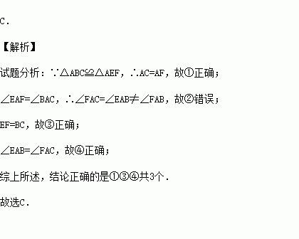 如图,△ABC≌△AEF,AB=AE,∠B=∠E,则对于结论①AC=AF,②∠FAB=∠EAB,③EF=BC,④∠EAB=∠FAC,其中正确结论的个数是( )