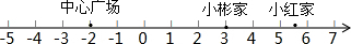 (1)以小明家为原点,以向东的方向为正方向,用1个单位长度表示1千米,请在数轴上标出中心广场,小彬家和小红家的位置吗?