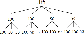 分析:首先根据题意画出树状图,然后由树状图求得所有等可能的结果与随机抽出两张,其和为150元的情况,再利用概率公式即可求得答案.
