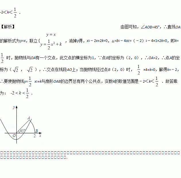 +k与扇形OAB的边界总有两个公共点,则实数k的取值范围是________.