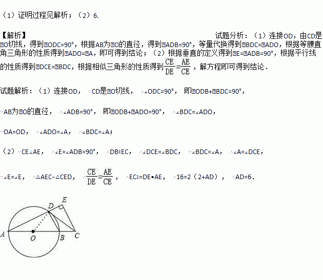 如图,AB是⊙O的直径,点C在AB的延长线上,CD与⊙O相切于点D,CE⊥AD,交AD的延长线于点E.