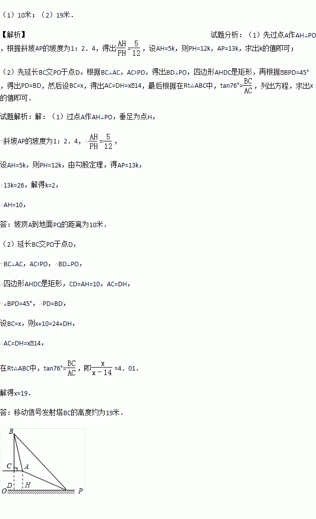 已知,如图,在坡顶A处的同一水平面上有一座古塔BC,数学兴趣小组的同学在斜坡底P处测得该塔的塔顶B的仰角为45°,然后他们沿着坡度为1:2.4的斜坡AP攀行了26米,在坡顶A处又测得该塔的塔顶B的仰角为76°.