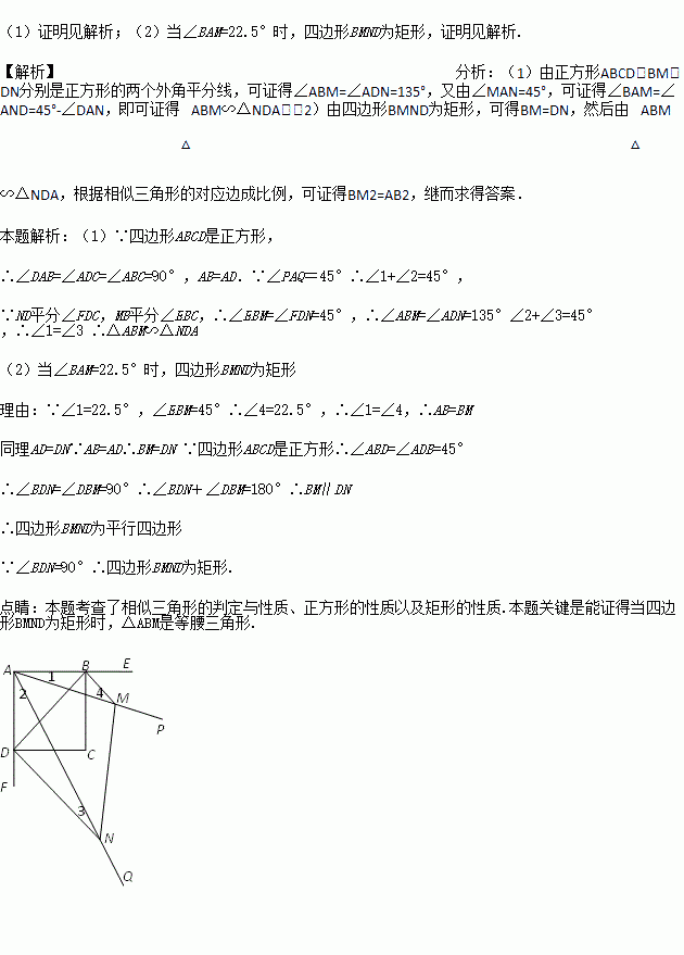 已知:如图,四边形ABCD是正方形,∠PAQ=45°,将∠PAQ绕着正方形的顶点A旋转,使它与正方形ABCD的两个外角∠EBC和∠FDC的平分线分别交于点M和N,连接MN.