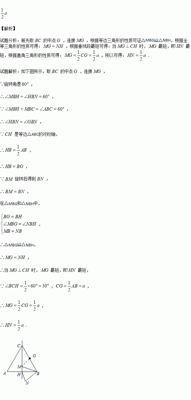 如图,边长为2a的等边三角形ABC中,M是高CH所在直线上的一个动点,连接MB,将线段BM绕点B逆时针旋转60°得到BN,连接HN.则在点M运动过程中,线段HN长度的最小值是 .
