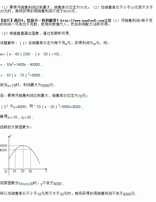 (2)要使月销售利润不低于8000元,请画出草图结合图象说明销售单价应如何定?