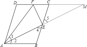 分析:延长AE、BC相交于点M,根据平行四边形的性质就可以得出∠1=∠M.∠B=∠MCE,通过证明△ABE≌△MCE就可以得出AE=EM,就可以得出∠AFE=∠CFE,进而得出结论.