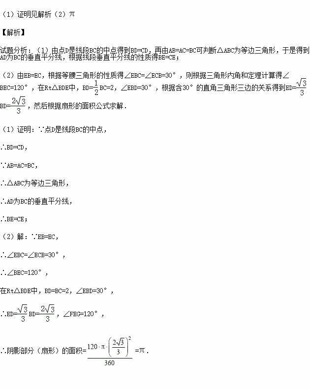 (2)以点E为圆心,ED长为半径画弧,分别交BE,CE于点F,G.若BC=4,EB平分∠ABC,求图中阴影部分(扇形)的面积.