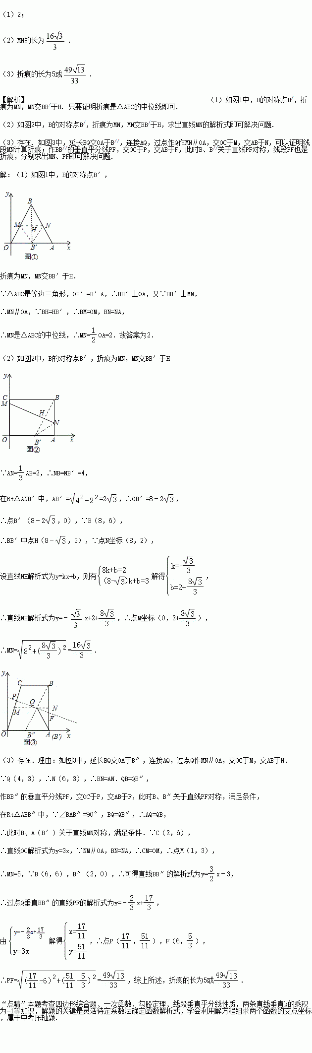 (3)如图③,四边形OABC位于平面直角坐标系中,其中OA=AB=6,CB=4,BC∥OA,AB⊥OA于点A,点Q(4,3)为四边形内部一点,将四边形折叠,使点B落在x轴上,问是否存在过点Q的折痕,若存在,求出折痕长,若不存在,请说明理由.