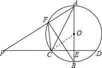 分析 根据已知条件得到△ACF∽△ACP,得到∠P=∠ACF,等量代换得到∠P=∠ABF,由AB是⊙O的直径,得到∠AFB=90°,推出AB⊥CD,根据垂径定理得到CE=DE=$\frac{1}{2}$CD=8,根据勾股定理得到AE=$\sqrt{A{C}^{2}-C{E}^{2}}$=8,连接OC,根据勾股定理列方程即可得到结论.