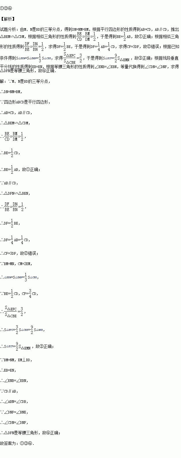 (2015秋•合肥期末)如图,?ABCD中,M、N是BD的三等分点,连接CM并延长交AB于点E,连接EN并延长交CD于点F,以下结论: