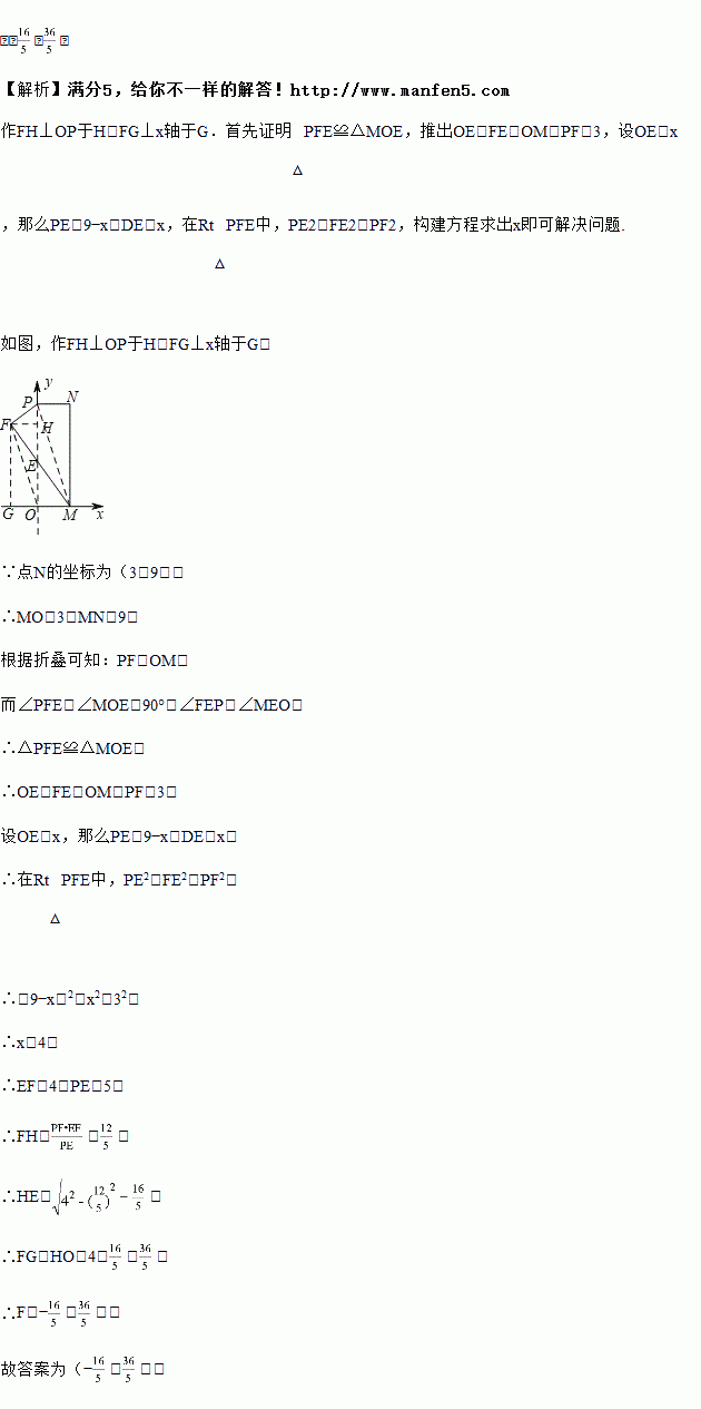 如图,在平面直角坐标系中,长方形MNPO的边OM在x轴上,边OP在y轴上,点N的坐标为(3,9),将矩形沿对角线PM翻折,N点落在F点的位置,且FM交y轴于点E,那么点F的坐标为_____.