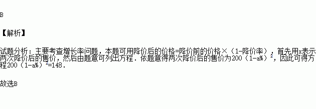 A. 200(1+a%)2=148 B. 200(1-a%)2=148