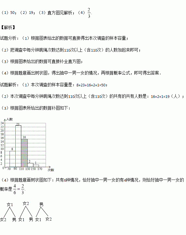 (4)如果跳绳次数达到130次以上的3人中有2名女生和一名男生,学校从这3人中抽取2名学生进行经验交流,求恰好抽中一男一女的概率(要求用列表法或树状图写出分析过程).