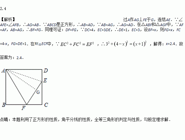 如图,已知正方形ABCD的边长为4,点E在CD边上,EC=3DE,点F在AD边上(异于点C),且∠AFE=∠AFB,则BF长为______.