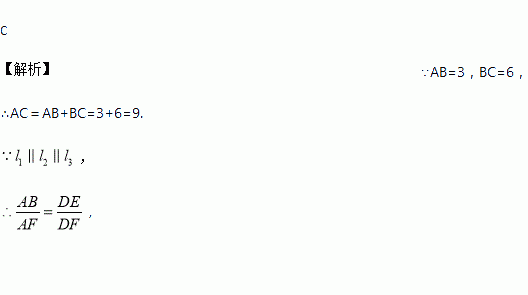 如图,两条直线l4,l5分别被三条平行直线l1,l2,l3所截,若AB=3,BC=6,DE=2,则DF的长为( )