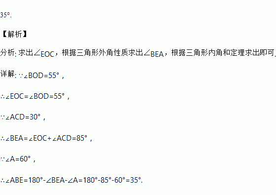 (题文)如图,在△ABC 中,∠A=60°,D 是 AB 上一点,E 是 AC 上一点,BE、CD 相交于 O,且∠BOD=55°,∠ACD=30°,则∠ABE 的度数是__________.