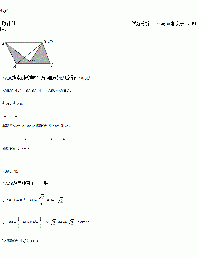 如图,在△ABC中,∠BAC=45°,AB=4cm,将△ABC绕点B按逆时针方向旋转45°后得到△A′BC′,则阴影部分的面积为 ___________cm2 .