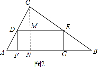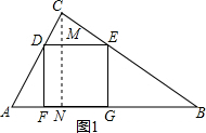 分析 作CN⊥AB于N,由四边形DEGF为正方形,可得CM⊥DE与求得AB、CN的值,还可证得△ABC∽△DEC,由相似三角形对应高的比等于相似比,即可求得正方形的边长;(1)作CN⊥AB,交DE于点M,交AB于点N,根据DE∥AB,得到△CDE∽△CAB,根据相似三角形的性质得到比例式,进而列出关于x的方程,求出方程的解,即可得到矩形的边长;
