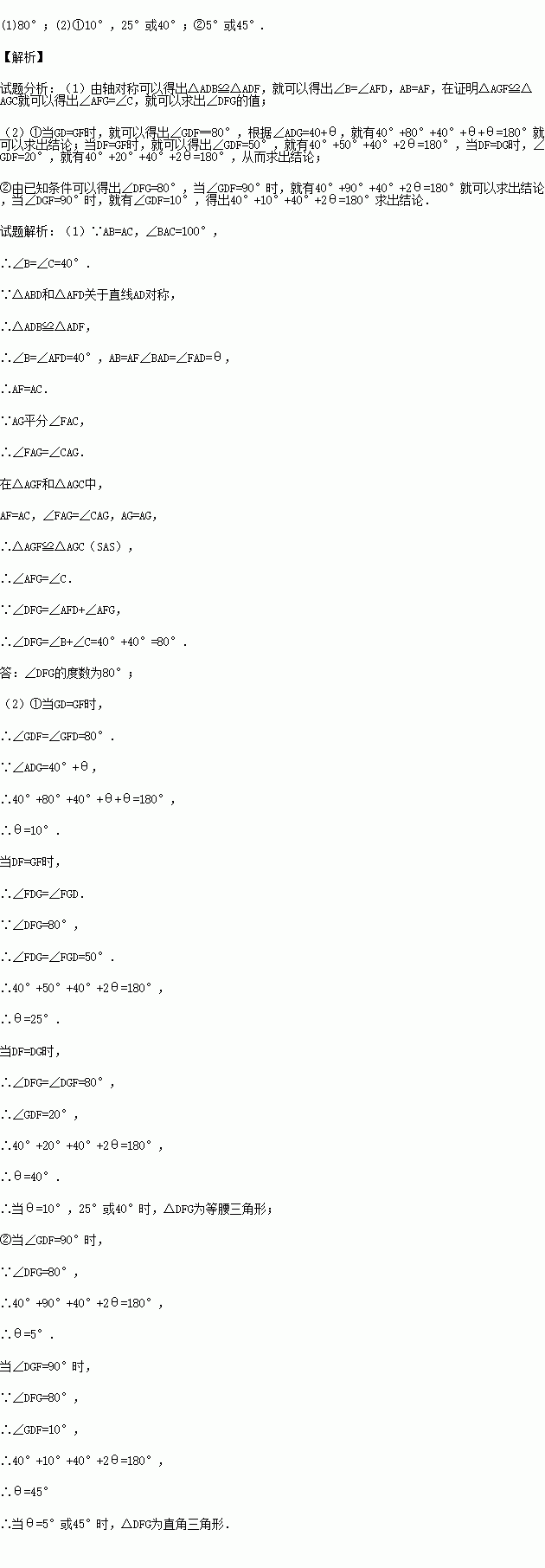 在△ABC中,AB=AC,∠BAC=100°,点D在BC边上,△ABD和△AFD关于直线AD对称,∠FAC的平分线交BC于点G,连接FG.