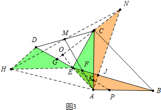 (3)结论:$\frac{AM}{BE}$=$\frac{\sqrt{2}}{2}$.作AN⊥BE,使得AN=BE,AN交BE于J,连接CN,NM,延长NM到H,使得MH=MN,连接HD、HE、AH、AE,延长NC交DE于G,延长AE交NG于O,延长DE到P.利用全等三角形的性质,想办法证明四边形EHAB是平行四边形,△ANH是等腰直角三角形即可.