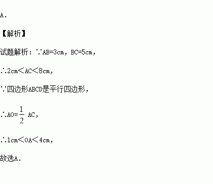如图,在平行四边形ABCD中,AB=3cm,BC=5cm,对角线AC,BD相交于点O,则OA的取值范围是( )