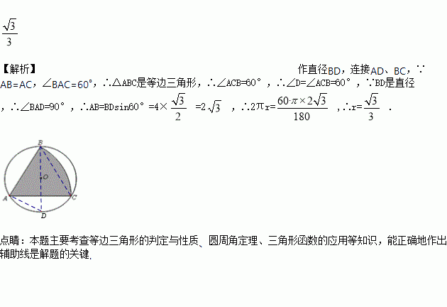 如图,有一直径为4的圆形铁皮,要从中剪出一个最大圆心角为60°的扇形ABC,用此剪下的扇形铁皮围成一个圆锥,该圆锥的底面圆的半径r=_________.