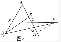 如图1,边长为6的等边△ABC中,点D沿射线AB方向由A向B运动,点F同时从C出发,以相同的速度沿射线BC方向运动,过点D作DE⊥AC,连结DF交射线AC于点G.