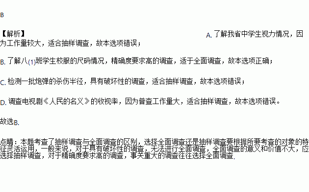 A. 了解我省中学生的视力情况 B. 了解八(1)班学生校服的尺码情况
