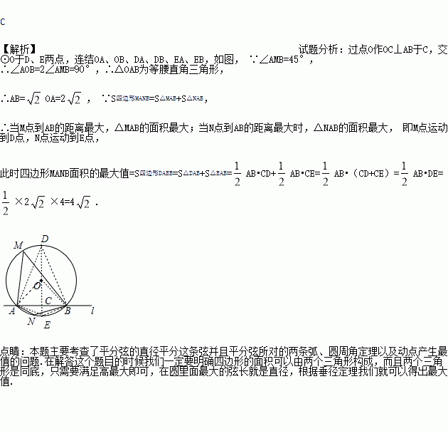 如图,⊙O的半径是2,直线l与⊙O相交于A、B两点,M、N是⊙O上的两个动点,且在直线l的异侧,若∠AMB=45°,则四边形MANB面积的最大值是( )