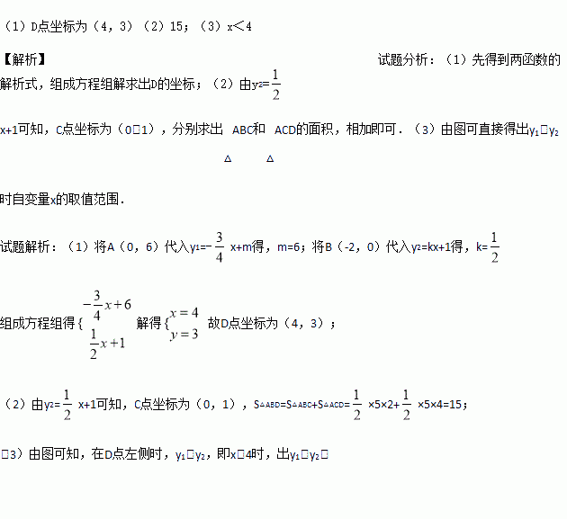 x+m与y轴交于点A(0,6),直线l2:y2=kx+1分别与x轴交于点B(-2,0),与y轴交于点C.两条直线相交于点D,连接AB.
