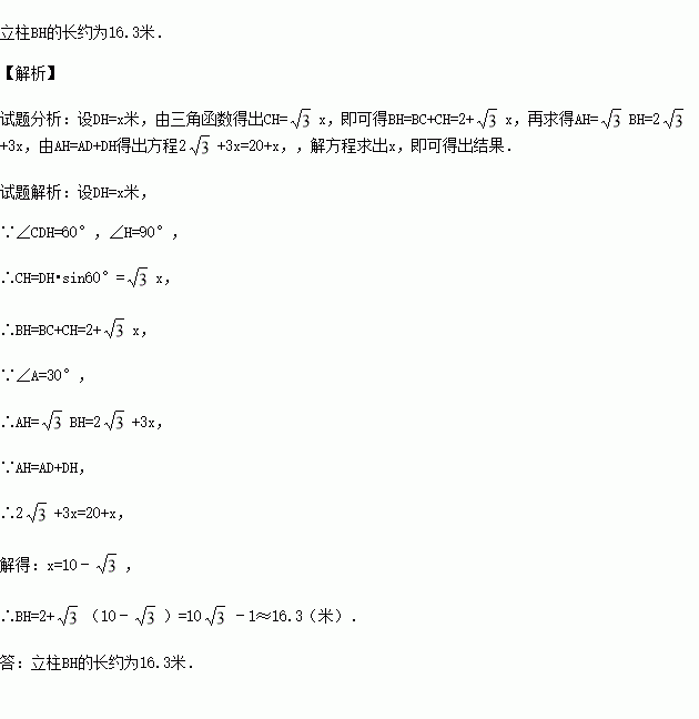 芜湖长江大桥是中国跨度最大的公路和铁路两用桥梁,大桥采用低塔斜拉桥桥型(如甲图),图乙是从图甲引申出的平面图,假设你站在桥上测得拉索AB与水平桥面的夹角是30°,拉索CD与水平桥面的夹角是60°,两拉索顶端的距离BC为2米,两拉索底端距离AD为20米,请求出立柱BH的长.(结果精确到0.1米,
