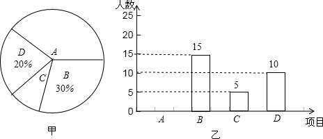 14.某学校开展课外体育活动,决定开设A:篮球、B:乒乓球、C:踢毽子、D:跑步四种活动项目.为了解学生最喜欢哪一种活动项目(每人只选取一种),随机抽取了部分学生进行调查,并将调查结果绘成如甲、乙所示的统计图,请你结合图中信息解答下列问题.