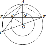 (2)连结AF,设小圆半径为R,由△OAB∽△FBA得:$\frac{OB}{BA}=\frac{AB}{FA}$,所以AB2=OB•AF=2R2,进而可求出AB=$\sqrt{2}$R,在RT△OAB中,OA=$\sqrt{3}$R,AG=$\frac{2\sqrt{3}}{3}$R,BG=$\frac{\sqrt{6}}{3}$R,在RT△AEG中,EG=$\frac{2\sqrt{6}}{3}$R,BE=$\frac{\sqrt{6}}{3}$R,继而可得到AE:AB:BE的比值.